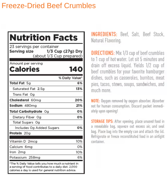 Freeze Dried Cooked Beef Crumbles, 25yr Shelf Life